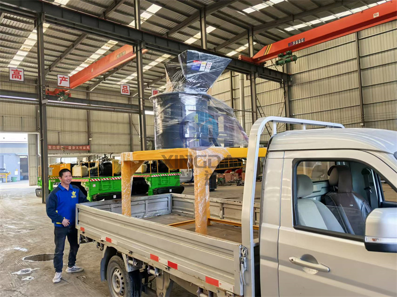一臺(tái)已經(jīng)包裝好的60型有機(jī)肥設(shè)備立式粉碎機(jī)正在裝車
