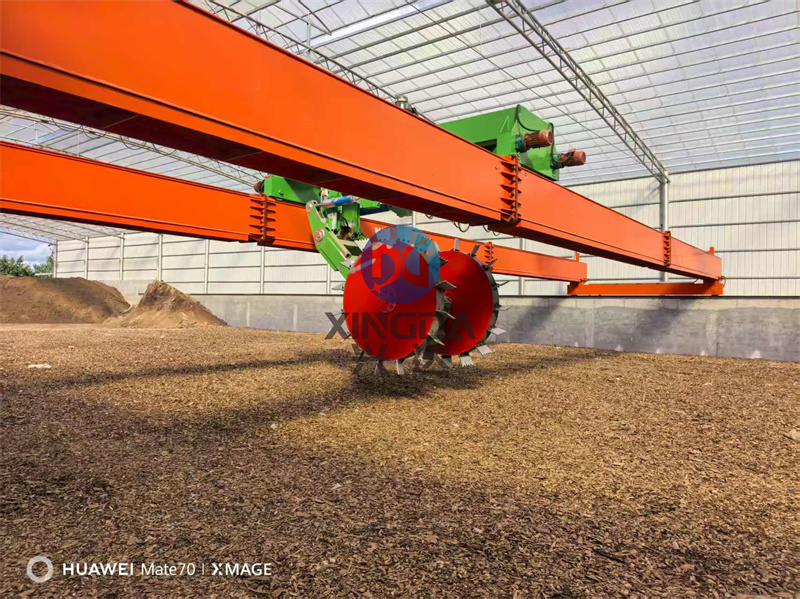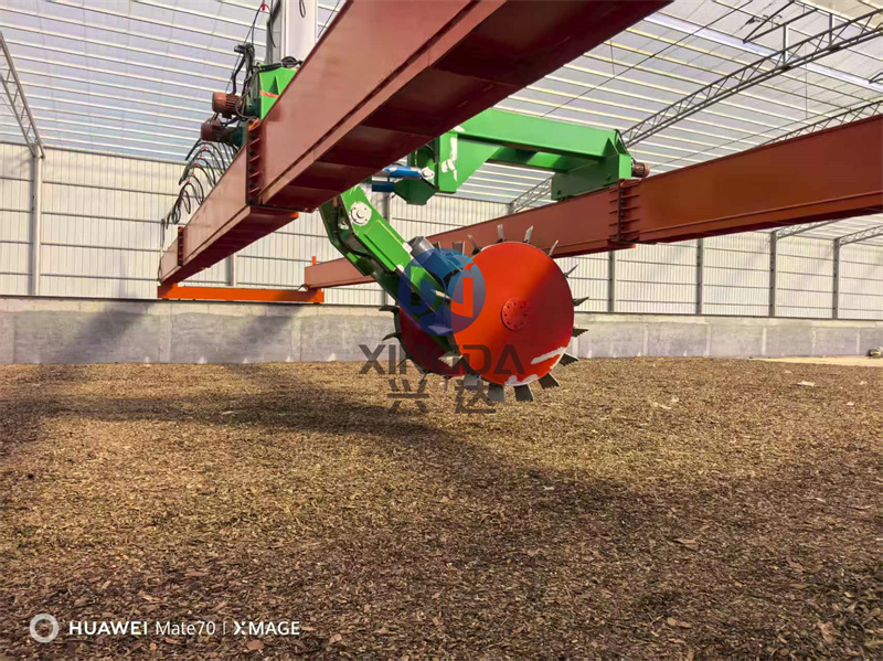 有機肥翻拋設(shè)備安裝現(xiàn)場:技術(shù)人員正在對22米有機肥設(shè)備輪盤式翻拋機正在安裝中