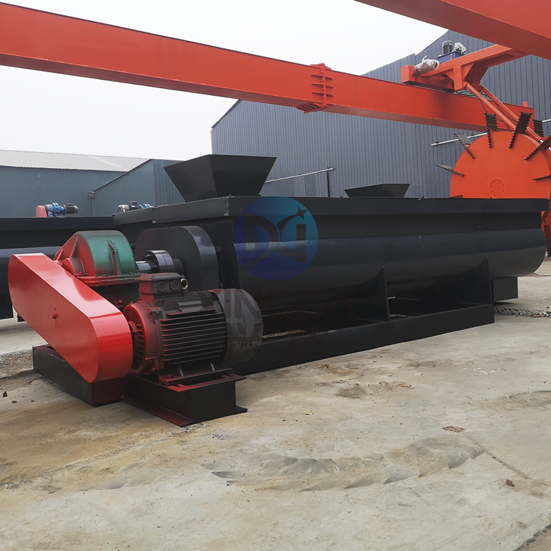 講解有機肥攪拌設備雙軸攪拌機如何試機:雙軸攪拌機利用兩根呈對稱狀的螺旋軸的同步旋轉,雙軸攪拌機內裝有旋轉反向的漿葉,漿葉成一定角度將物料沿軸向、徑向循環(huán)翻攪,使物料迅速混合均勻。由電機通過皮帶傳動到減速機帶動軸旋轉。軸的速度與槳葉的結構會使物料重力減弱,隨著重力的缺乏,各物料存在的顆粒大小、比重懸殊的差異在混合過程中被忽略。即使物料有比重、粒徑的差異,在交錯布置的攪拌葉片快速劇烈的翻騰拋灑下,也能達到很好的混合效果。該系列混合機是我公司研制的新一代混合設備,該機混合度高,殘留量少,適合于兩種以上肥料,添加劑預混料得混合,及配合飼料、濃縮飼料、添加劑預混飼料等的混合。